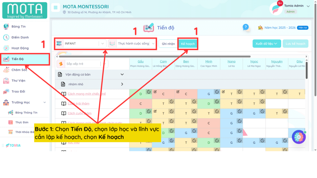 Bước 1: Chọn Tiến Độ, chọn lớp học và lĩnh vực cần lập kế hoạch, chọn Kế hoạch