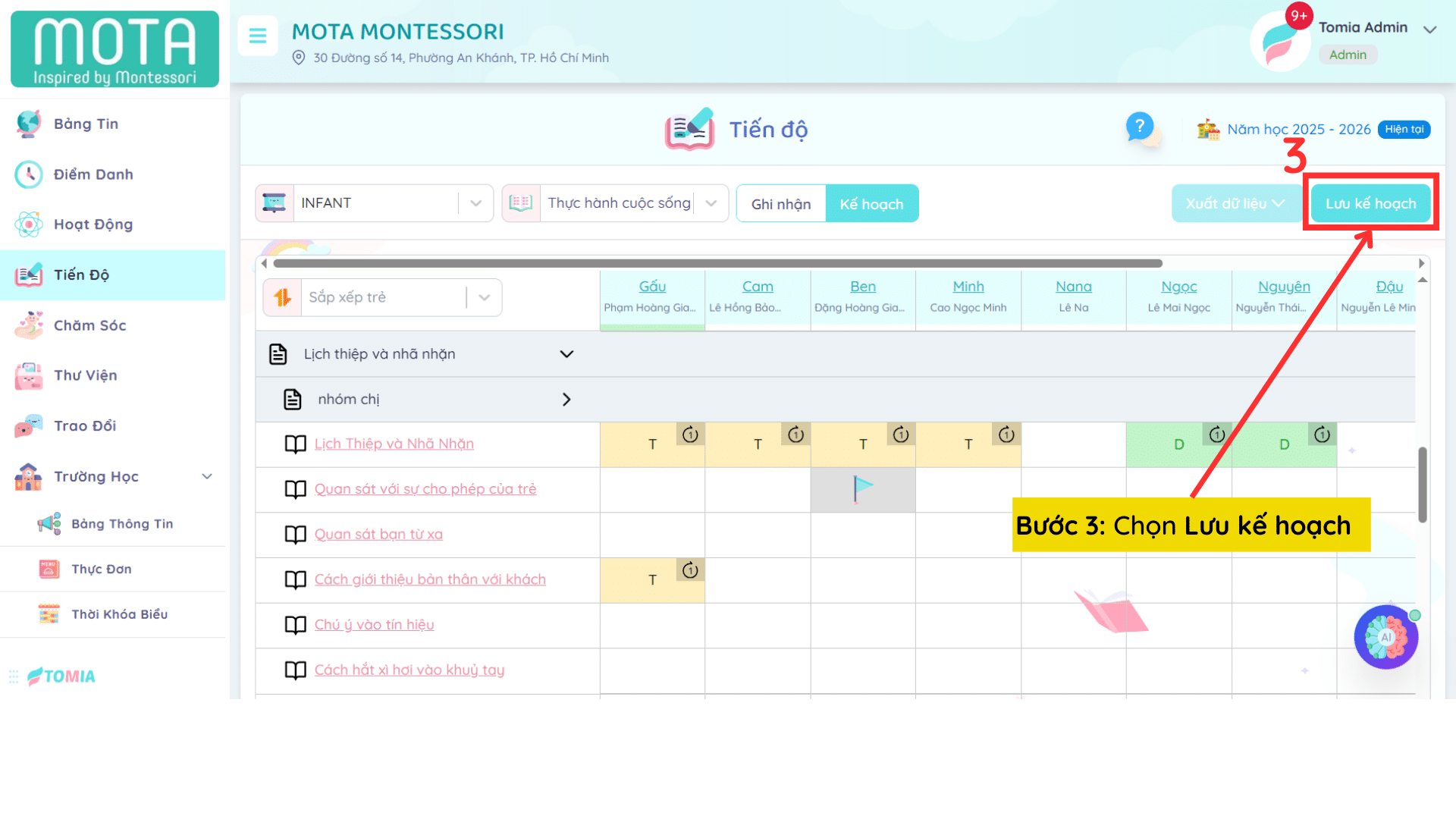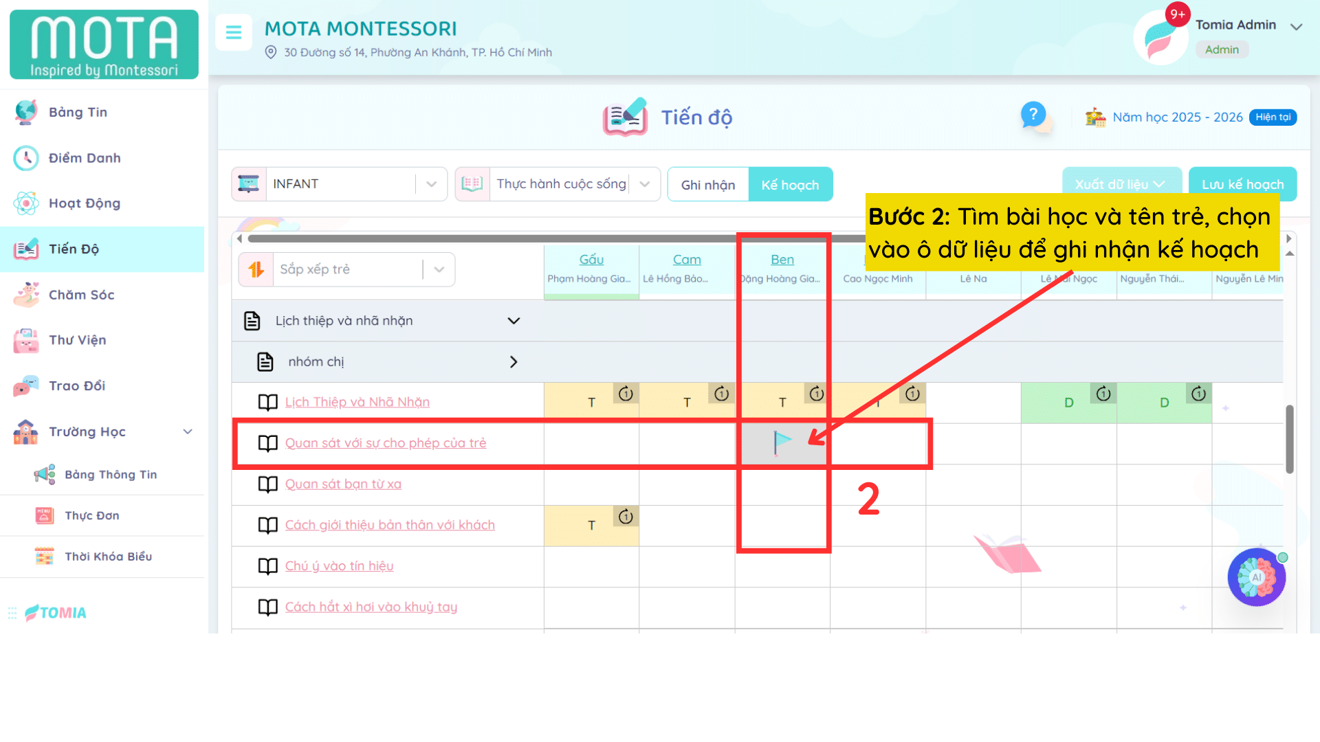 Bước 2: Tìm bài học và tên trẻ, chọn vào ô dữ liệu để ghi nhận kế hoạch