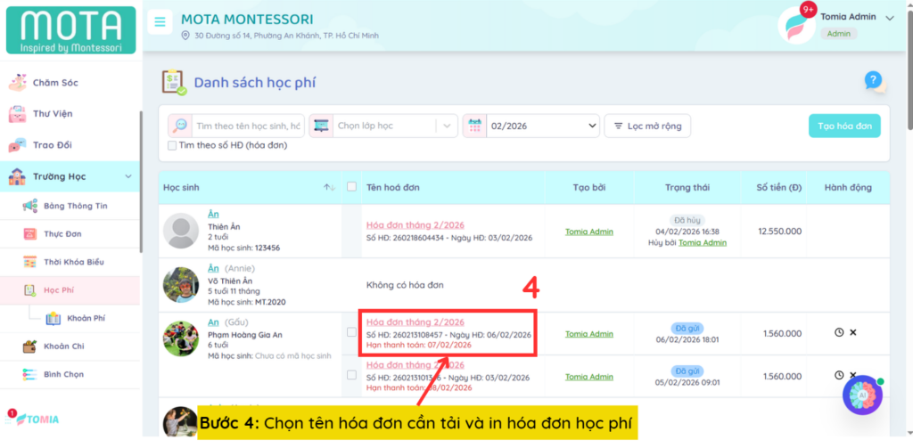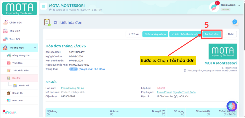 Để thực hiện thao tác tải và in hóa đơn học phí của trẻ chúng ta thực hiện các bước sau: