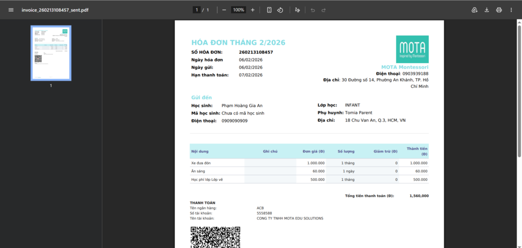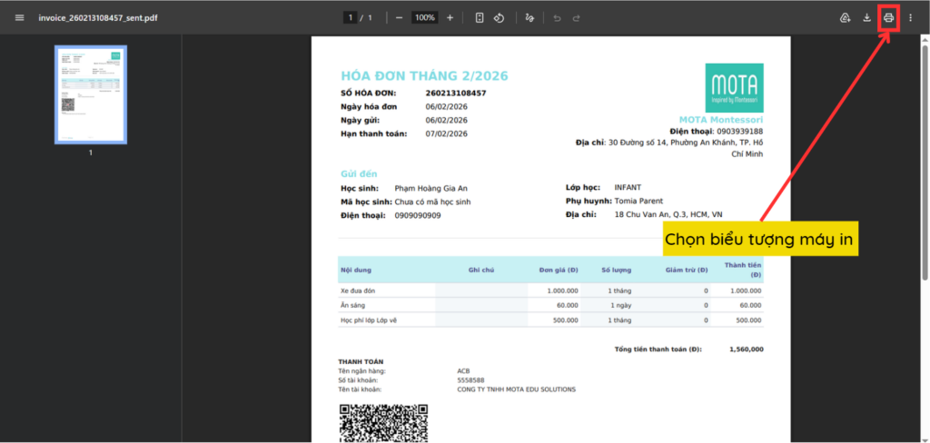 Vậy là chúng ta đã hoàn thành thao tác tải và in hóa đơn học phí của trẻ.