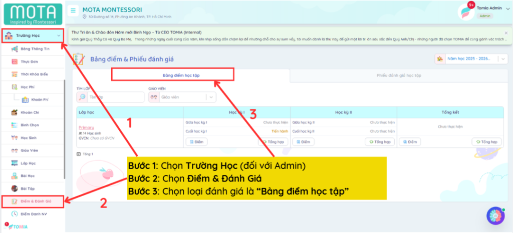 Tính năng Điểm và Đánh giá sẽ được bật/tắt tùy vào nhu cầu sử dụng của nhà trường, vui lòng liên hệ đội ngũ TOMIA để được hỗ trợ cấu hình.