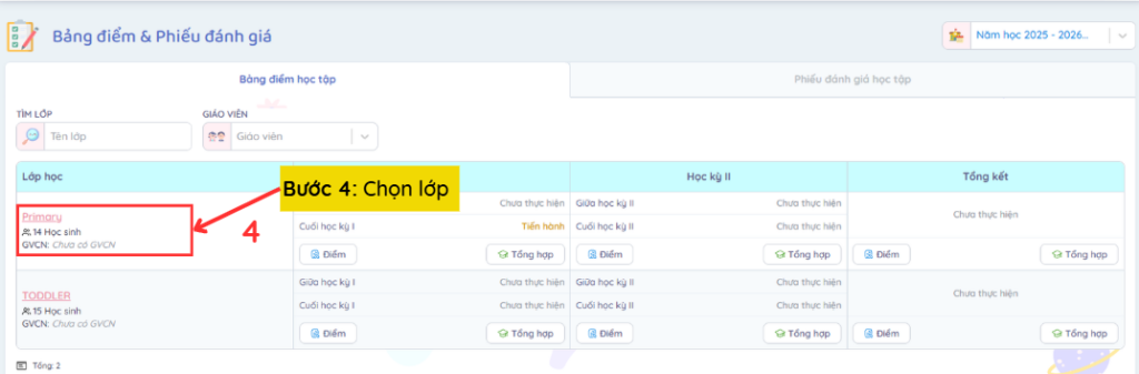 Bước 5: Trong chi tiết lớp học, chọn biểu tượng Bảng điểm học tập