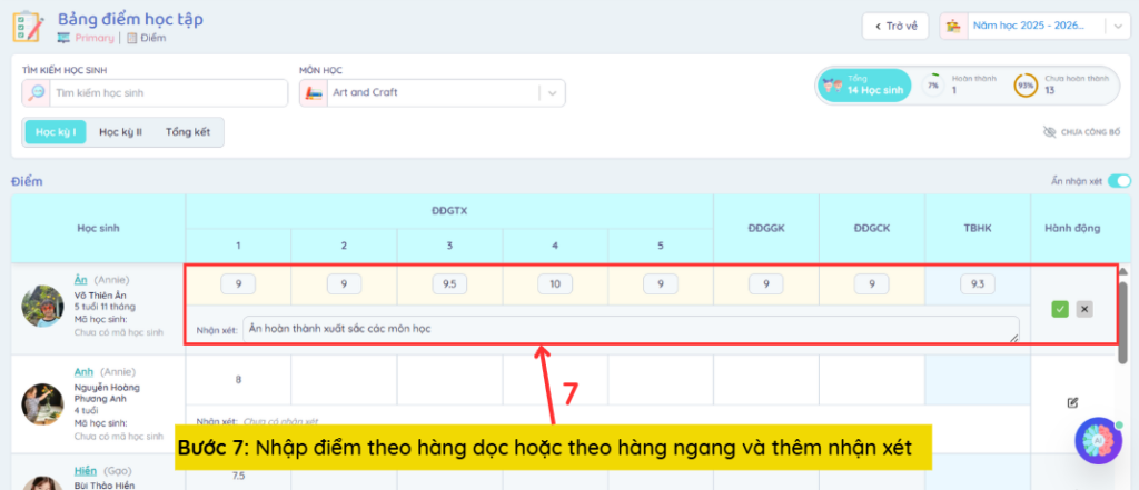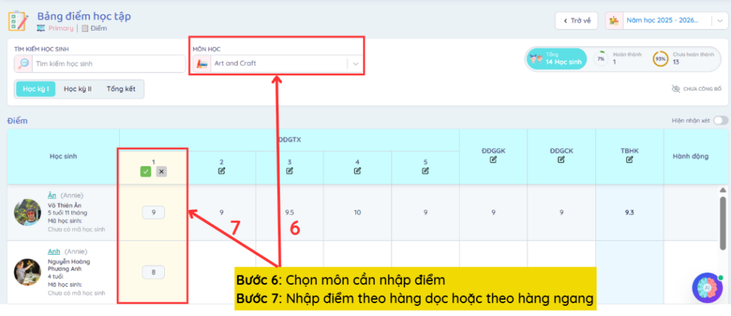 Lưu ý: Sau mỗi lần nhập điểm theo hàng dọc hoặc hàng ngang, Admin và Giáo viên cần chọn biểu tượng dấu tick để lưu thông tin.