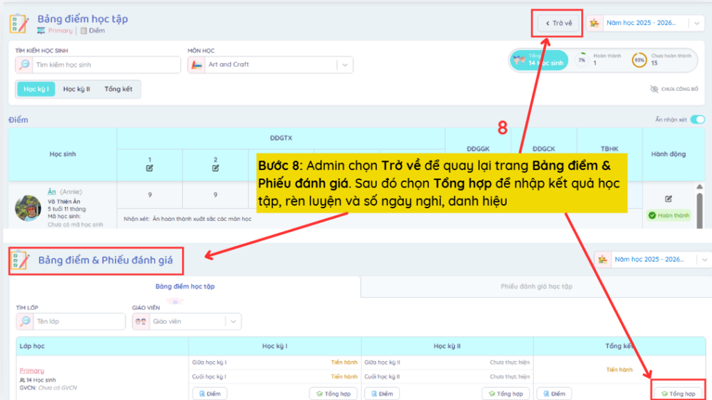 Bước 8: Admin chuyển sang trang Tổng hợp, chọn biểu tượng chỉnh sửa để nhập kết quả học tập, rèn luyện và số ngày nghỉ, sau đó chọn dấu tick để lưu