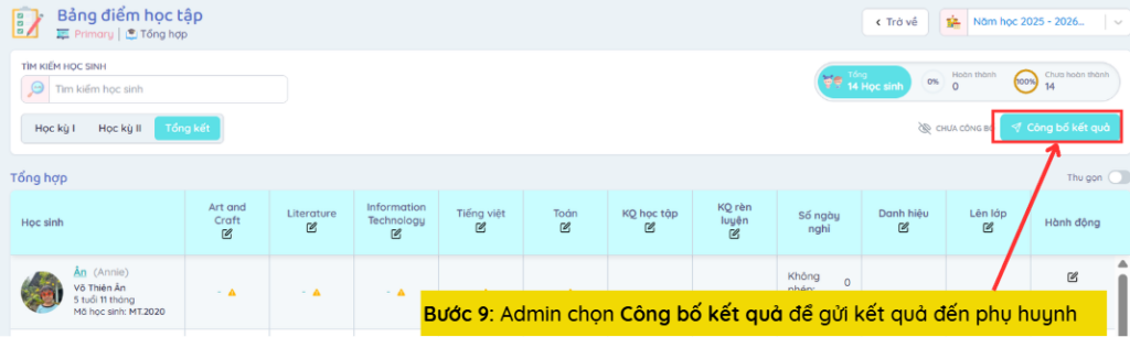 Bước 9: Admin chọn Công bố kết quả để gửi kết quả đến phụ huynh