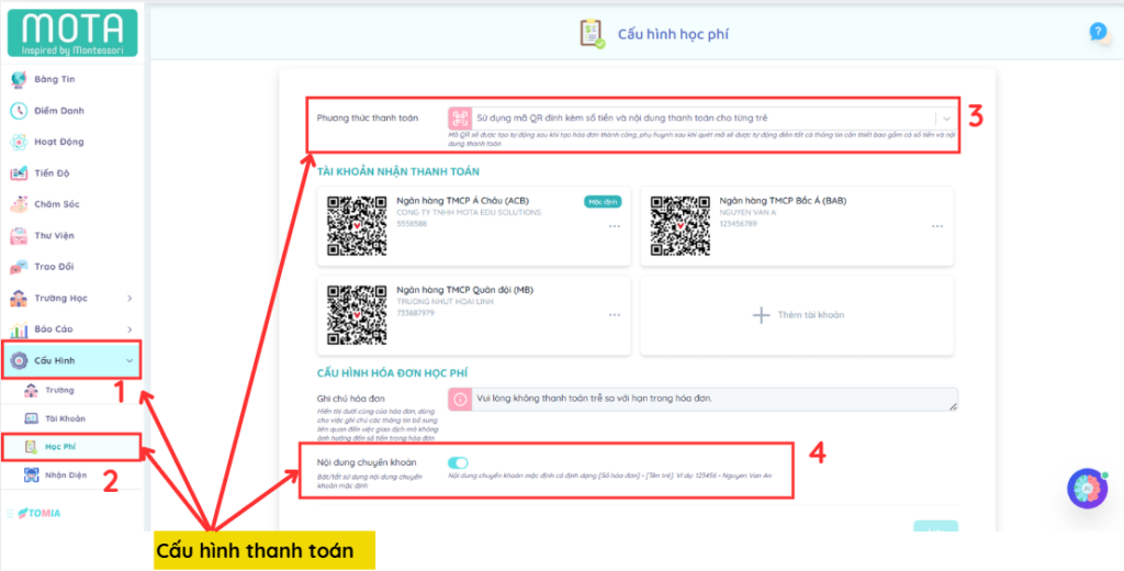 Tại giao diện Cấu hình học phí, Admin tiếp tục thực hiện cấu hình thanh toán “Sử dụng mã QR đính kèm số tiền và nội dung thanh toán cho từng trẻ” và chọn bật Nội dung chuyển khoản như hình minh họa.