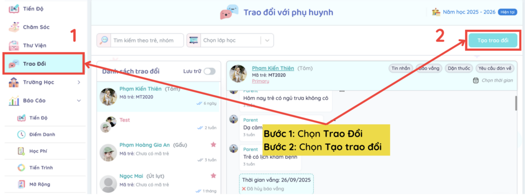 Bước 5: Chọn những trẻ cần tạo trao đổi nhóm. Ở bước này, giáo viên có thể chọn Cả lớp để tạo trao đổi với toàn bộ trẻ thuộc lớp đã chọn hoặc chọn tên từng trẻ cần tạo trao đổi.