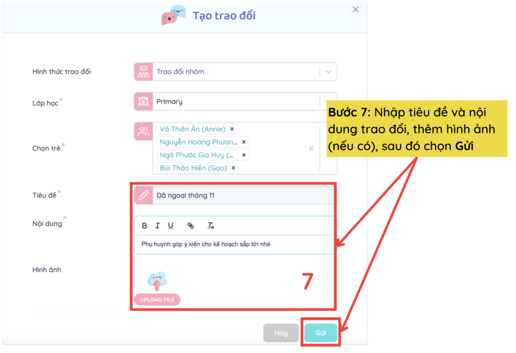 Bước 7: Nhập tiêu đề và nội dung trao đổi, thêm hình ảnh (nếu có), sau đó chọn Gửi