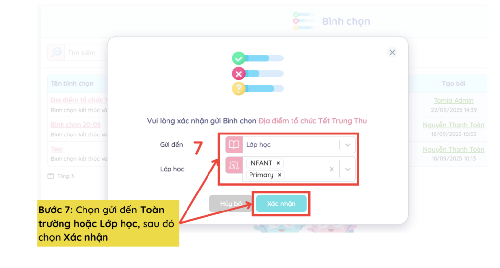 Bước 7: Chọn gửi đến Toàn trường hoặc Lớp học, sau đó chọn Xác nhận
