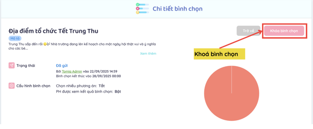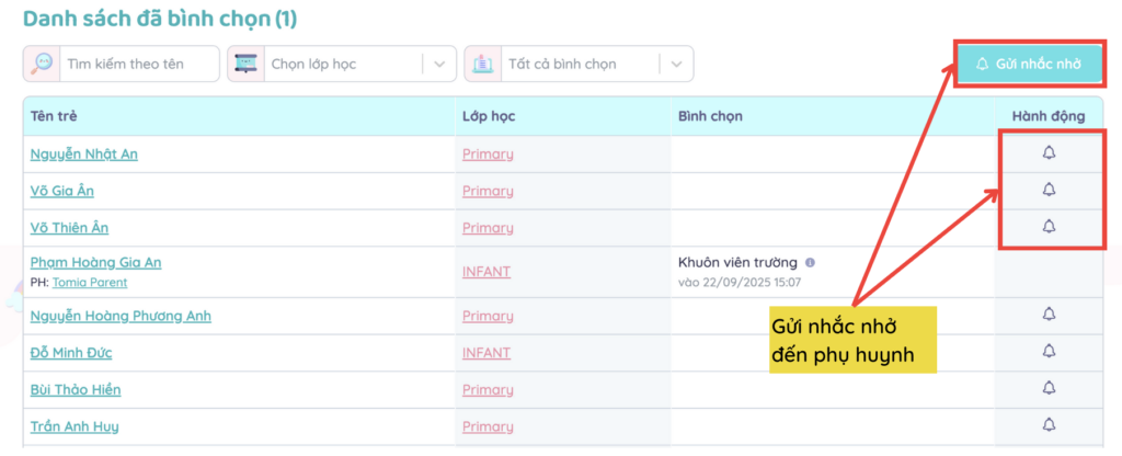 Khi cuộc bình chọn ở trạng thái đã gửi, Admin và giáo viên có thể gửi nhắc nhở bình chọn đến với phụ huynh hoặc khóa bình chọn