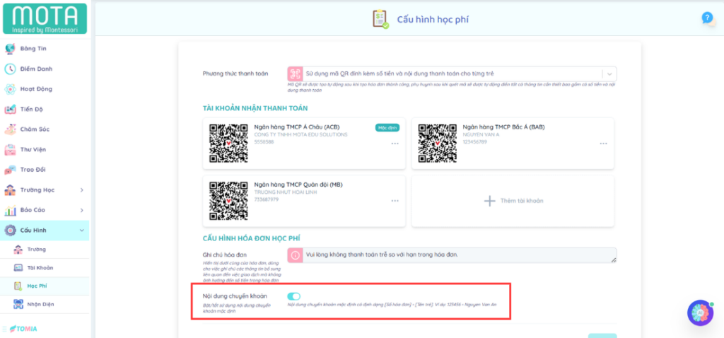 Lưu ý: Hiện tại, TOMIA chỉ hỗ trợ theo dõi trạng thái theo phương thức thanh toán Sử dụng mã QR đính kèm số tiền và nội dung thanh toán cho từng trẻ ở phần Cấu hình học phí và bật Nội dung thanh toán.