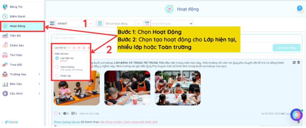 Bước 2: Chọn tạo hoạt động cho Lớp hiện tại, Nhiều lớp hoặc Toàn trường