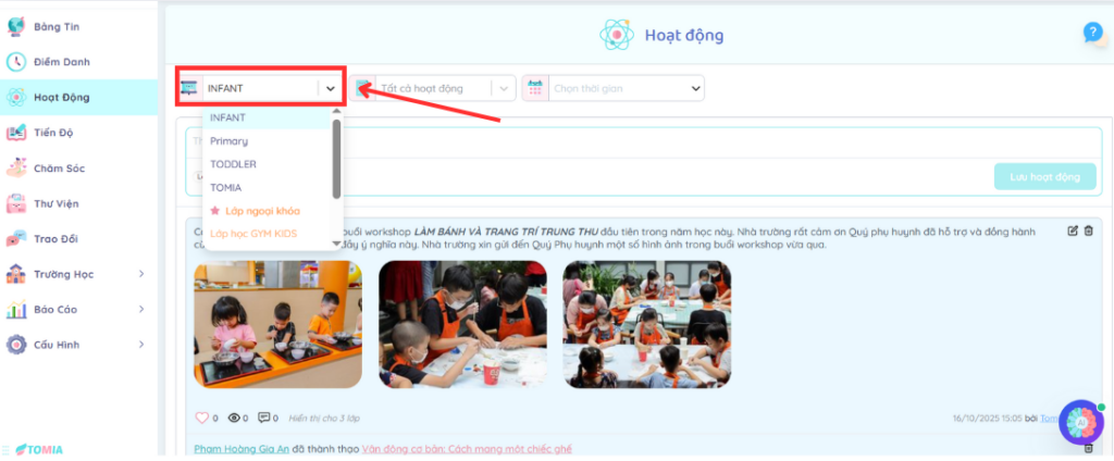 - Nếu chọn đăng hoạt động cho Lớp hiện tại, vui lòng chọn lớp cần đăng hoạt động trên thanh tác vụ.