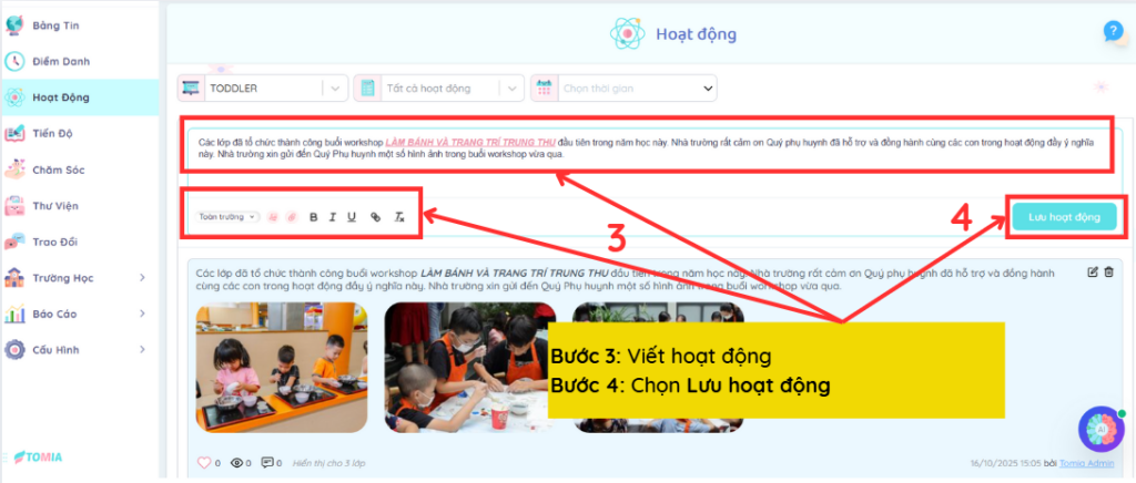Để tạo một bài nhật ký hoạt động cho trẻ, Admin và giáo viên có thể thực hiện các bước sau đây: