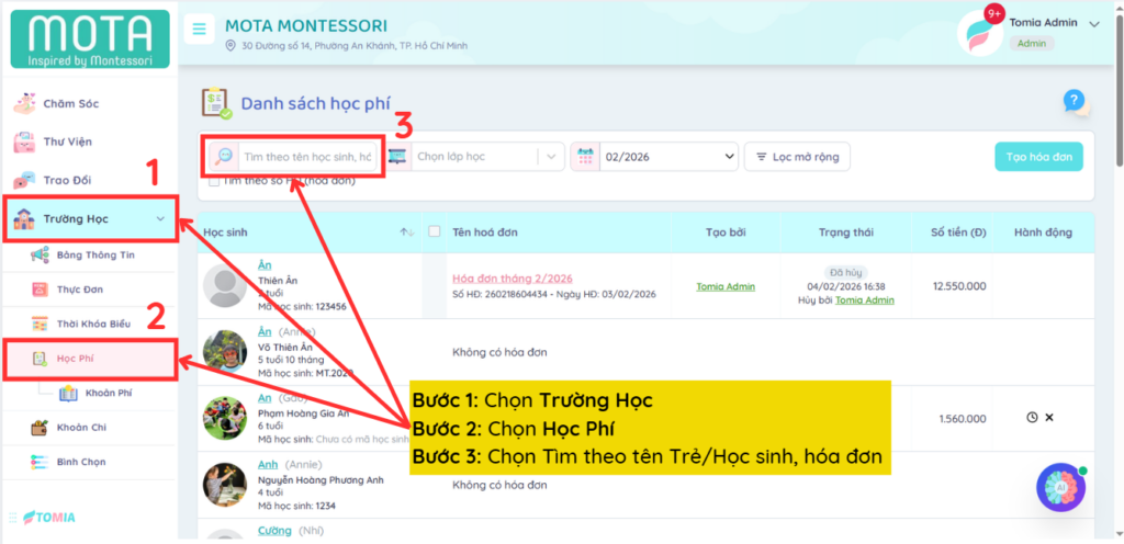 Bước 3: Chọn Tìm theo tên Trẻ/Học sinh, hóa đơn