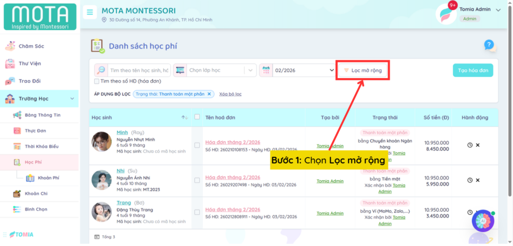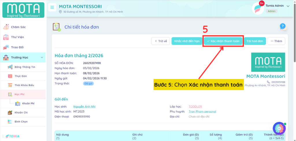[Web] – Hướng dẫn xác nhận hóa đơn khi phụ huynh thanh toán một phần