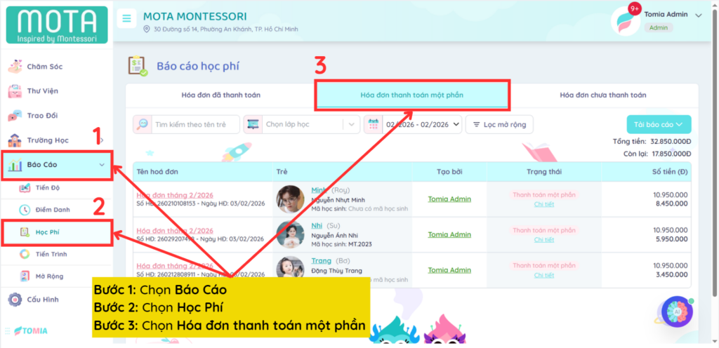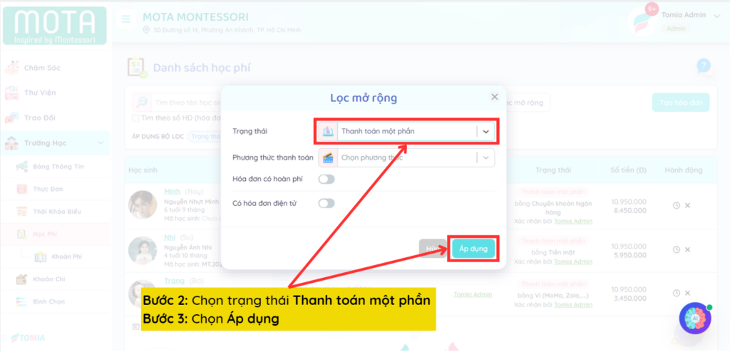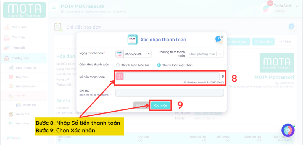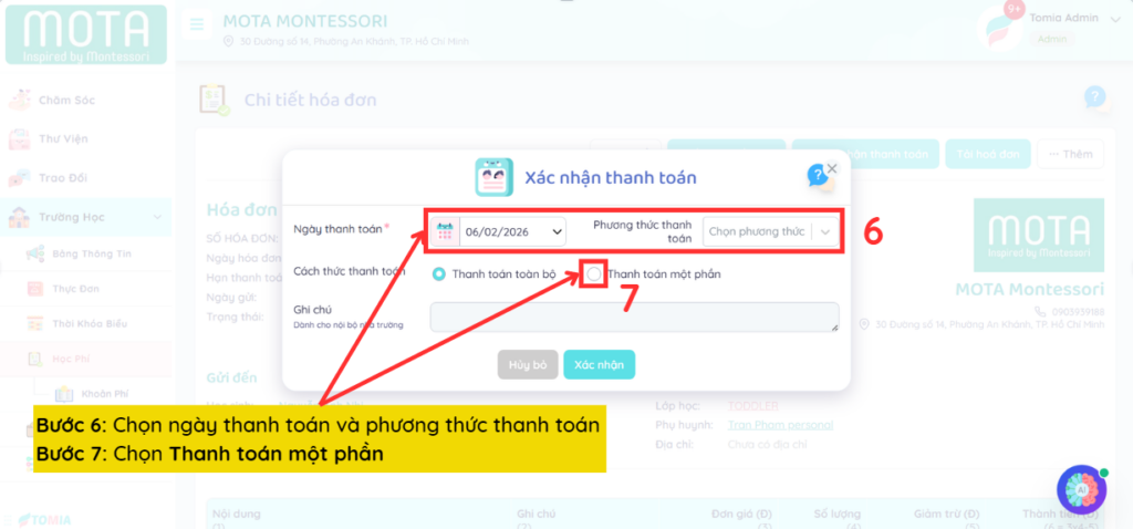Trong trường hợp phụ huynh chỉ thanh toán một phần của học phí, nhà trường có thể thực hiện các thao tác sau đây xác nhận thanh toán một phần: