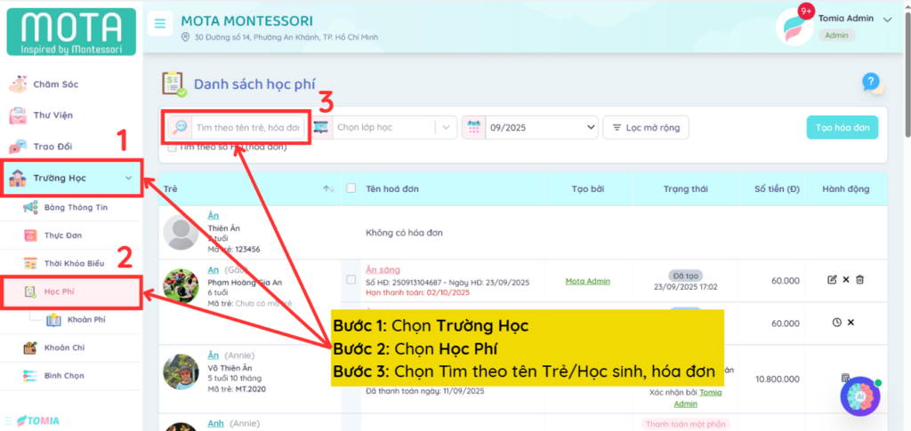 Bước 3: Chọn Tìm theo tên Trẻ/Học sinh, hóa đơn cần xóa hóa đơn học phí