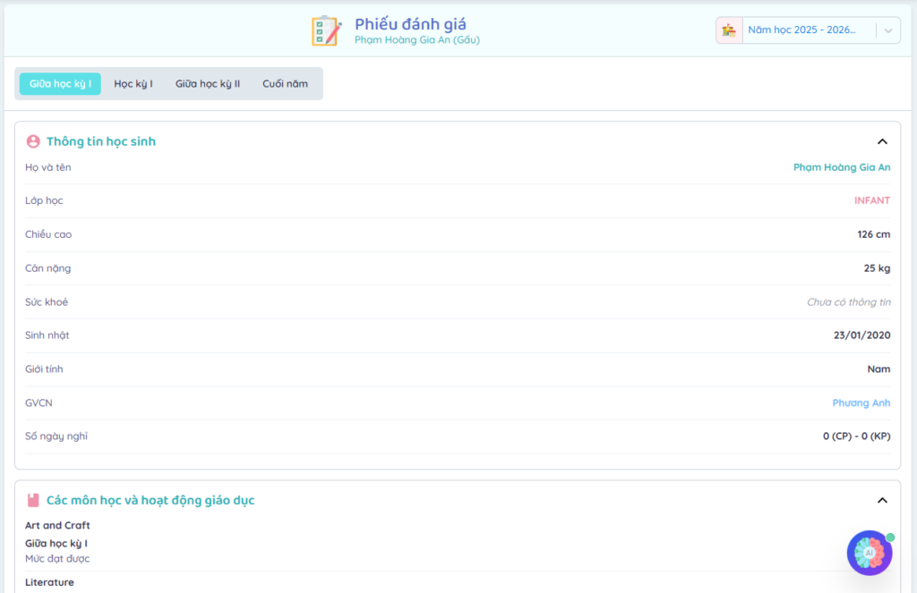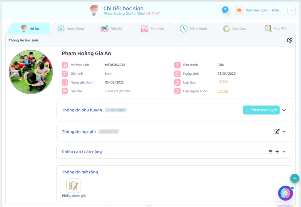 Ở trang này sẽ có các thông tin cá nhân của trẻ như: Biệt danh, Ngày tháng năm sinh, Lớp học, Ngày ghi danh, Thông tin phụ huynh, Thông tin học phí, Chiều cao / cân nặng.