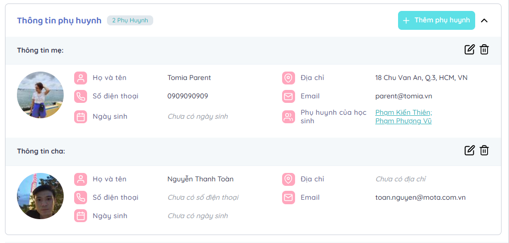 Sau đây Hệ thống Quản lý Trường học TOMIA sẽ giới thiệu cụ thể về trang thông tin chi tiết cá nhân của trẻ.