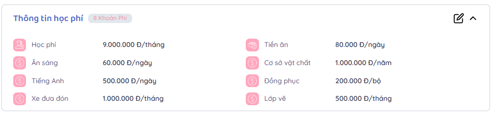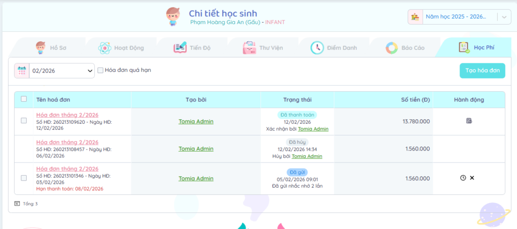 Ở mục này sẽ có tất cả các thông tin về hoá hơn học phí của trẻ: