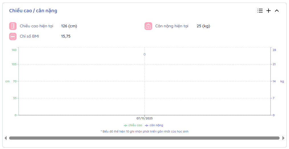 Ngoài ra, còn hiển thị bảng chỉ số BMI của trẻ và Phiếu đánh giá/ Bảng điểm.