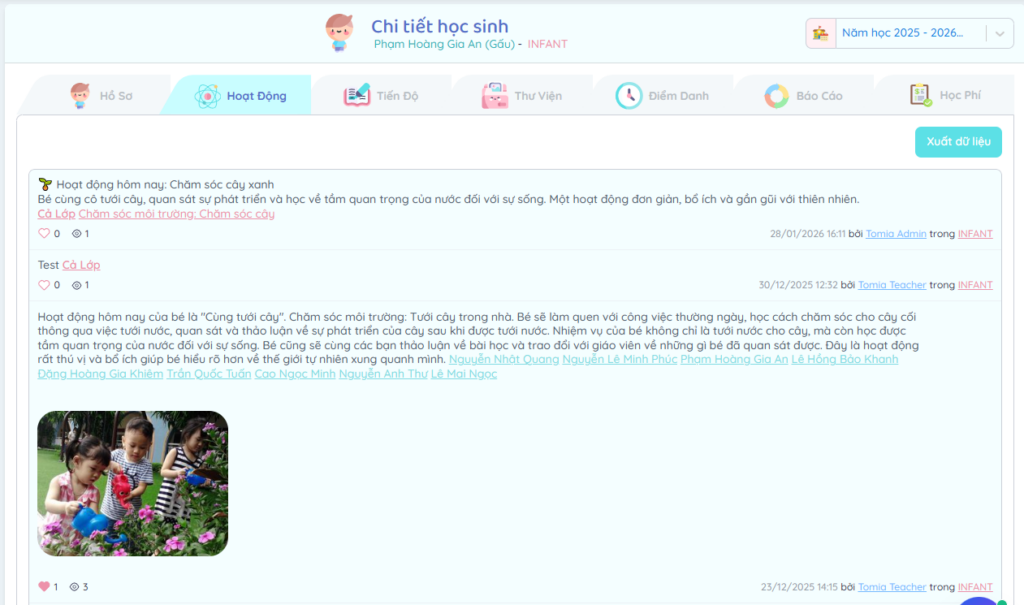 Ngoài ra, khi giáo viên cập nhật tiến độ của trẻ thì vẫn sẽ được hiện lên ở trang này.