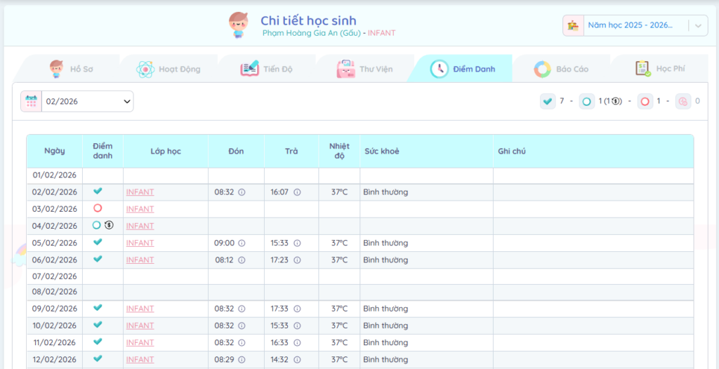Danh sách các ngày trẻ tham gia lớp học sẽ được hiển thị chi tiết: