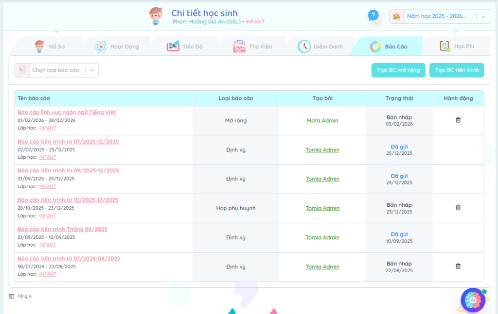 Ngoài ra, tất cả báo cáo tiến trình của trẻ đã được tạo đều được liệt kê, thể hiện ra đầy đủ thông tin: